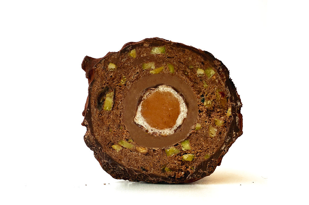 Surrounding each nut gianduja, ( roasted hazelnuts and chocolate smooshed together until smooth) with pockets of whisky soaked cherries, passionfruit and toasted nuts.