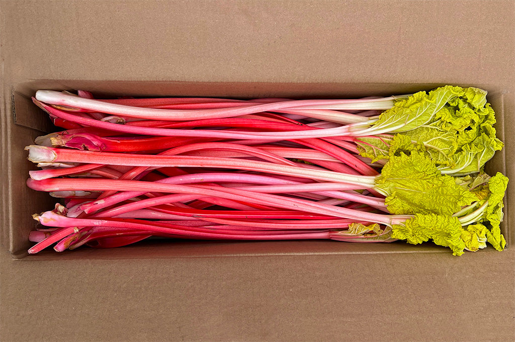 Forced Rhubarb are grown in the dark starting in the middle of Winter ( first crops of Spring). The sprouts looking for light, grow so fast farmers can hear it pop and squeak its way out of the soil. It's very cool to hear! Some growers harvest by candlelight. The colour of the stalks are very pretty pale pinks and greens from the lack of light. Forced rhubarb stalks are tender, thin and sweeter than the thick, bright red, stalks of Summer.